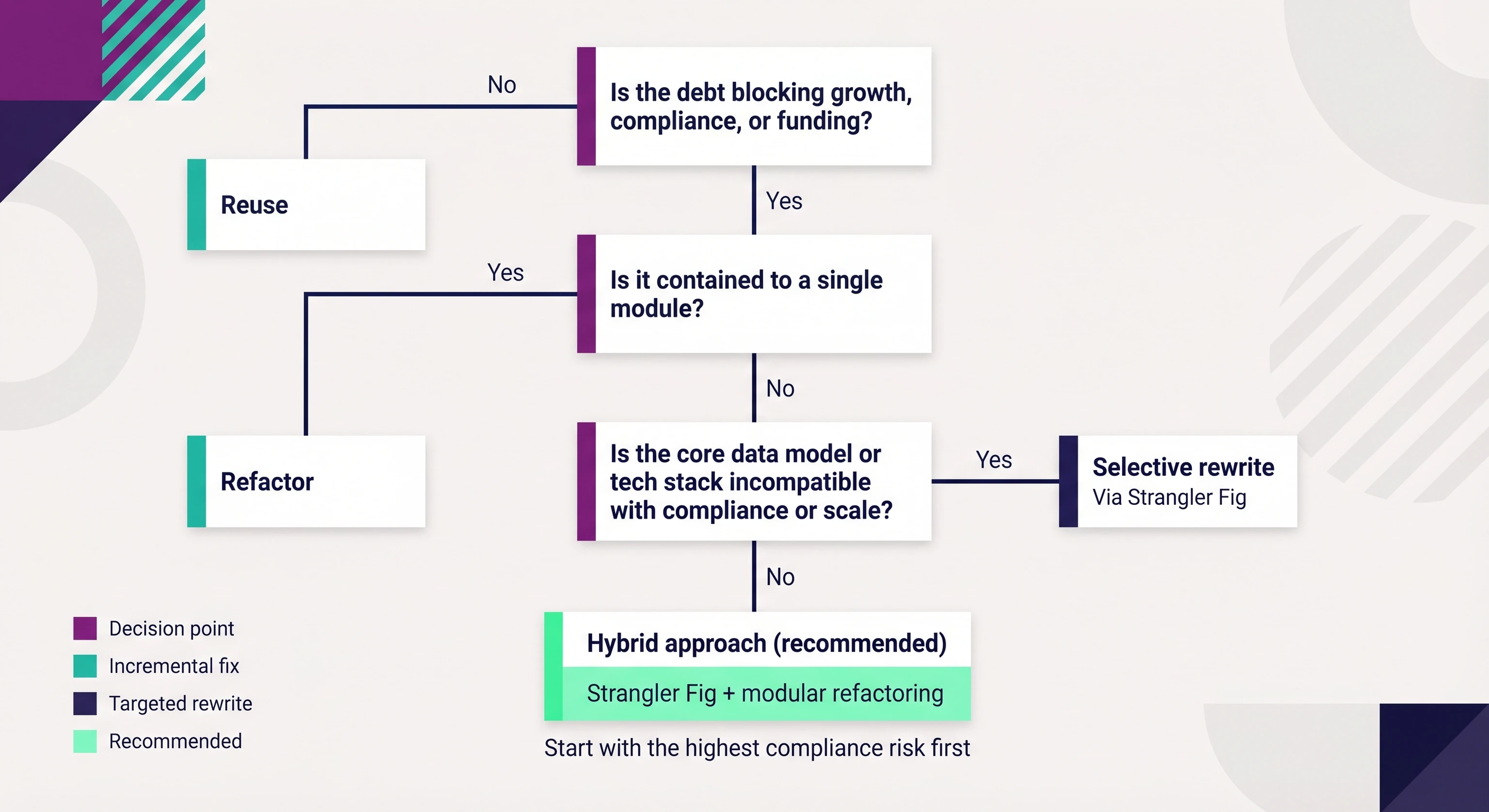 There are situations where patching isn't enough. A rewrite becomes worth considering when the core data model is fundamentally incompatible with compliance requirements. For example, PHI scattered across the system with no centralized, auditable handling, where retrofitting would require touching everything anyway. Or when the technology stack is genuinely end-of-life with no active security support, making HIPAA compliance structurally impossible without starting fresh.